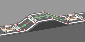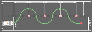 Занимаем исходную позицию у отметки "СТАРТ", включаем I передачу и начинаем движение. Достаточно интенсивно вращаем руль влево и как только правое колесо пересекло линию между стартовой фишкой и фишкой "А" начинаем вращать руль вправо стараясь выставить автомобиль параллельно линии фишек. Как только правое зеркало автомобиля поравнялось с фишкой "А", интенсивно вращаем руль вправо. При пересечении левым передним колесом воображаемой линии между фишками "А" и "Б" выравниваем траекторию движения параллельно линии фишек. Также минуем оставшиеся фишки и подъезжаем к отметке "СТОП". Выключаем сцепление, выключаем передачу (ставим в нейтральное положение), ставим на стояночный тормоз.