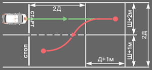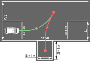 Занимаем исходную позицию у отметки "СТАРТ", включаем I передачу и проезжаем к фишке "А" так, чтобы переднее левое крыло автомобиля было с ней на одном уровне. Продолжая медленное движение, интенсивно вращаем руль вправо до упора и доезжаем как можно ближе к фишке "Б", останавливаемся у нее, вращаем руль влево. Включаем заднюю передачу и контролируя по зеркалам или повернувшись назад двигаемся задним ходом до линии, соединяющей фишки “А” и "В", останавливаемся у нее. Вращаем руль вправо, вновь включаем I передачу и доезжаем до отметки "СТОП". Выключаем сцепление, выключаем передачу (ставим в нейтральное положение), ставим на стояночный тормоз. Убираем ноги с педалей.
